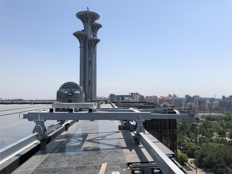 該項(xiàng)目所配備的屋面軌道式擦窗機(jī)工作高度460米,采用立柱升降式機(jī)構(gòu),擦窗機(jī)卷揚(yáng)機(jī)構(gòu)為特殊定制。擦窗機(jī)在停機(jī)時(shí)可實(shí)現(xiàn)隱藏效果。